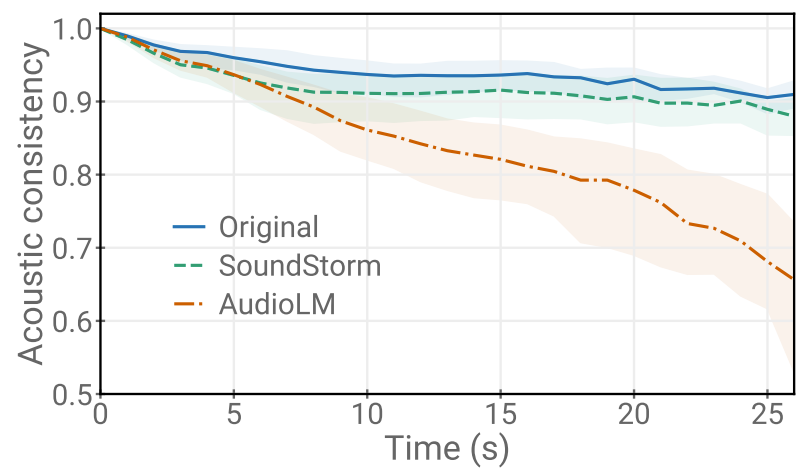 - Consistency drift 측면에서 SoundStorm은 AudioLM에 비해 긴 audio sample에 대해서도 우수한 성능을 유지함