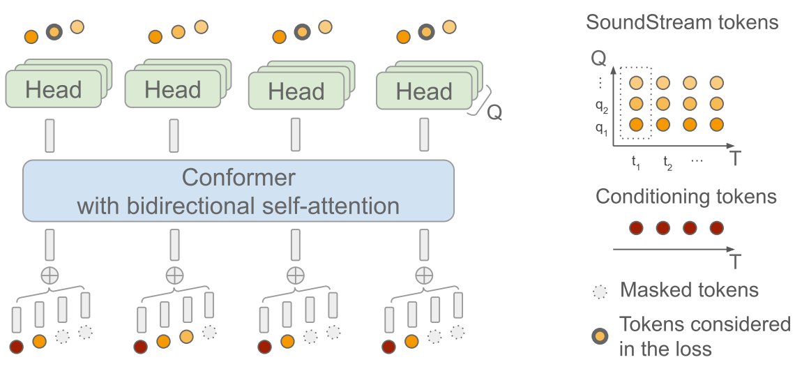 - AudioLM의 semantic token과 같은 conditioning signal이 주어지면, masked audio token을 예측하도록 training 된 bidirectional attention-based Conformer를 활용