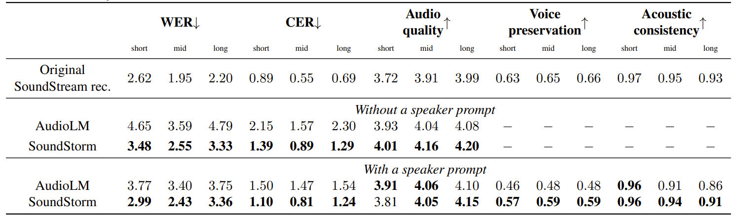 - Speech intelligibility 측면에서 SoundStorm은 prompted/unprompted scenario 모두에서 AudioLM 보다 우수한 성능을 보임