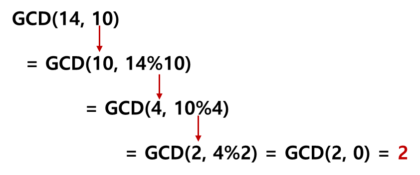 - 유클리드 호제법은 재귀로 구현 가능함