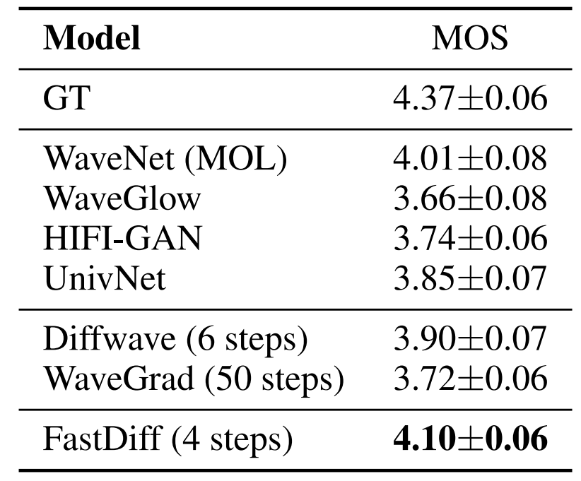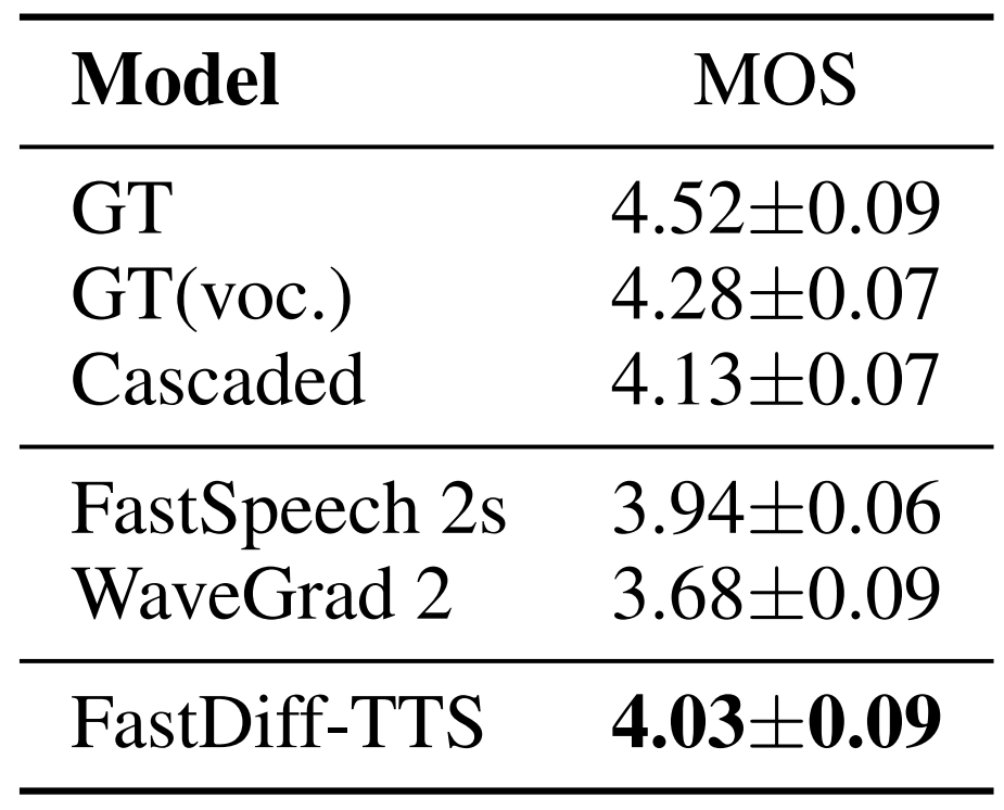 - FastDiff-TTS는 FastSpeech2와 같은 기존 TTS 모델보다 더 우수한 MOS 성능을 달성함