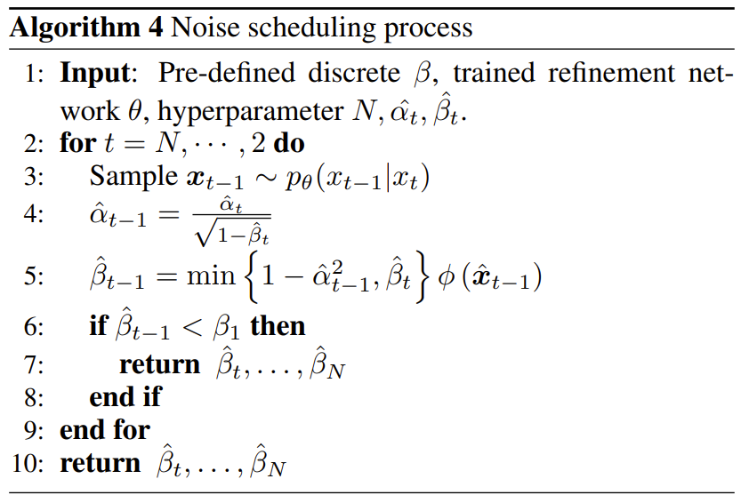 - 먼저 one-shot noise scheduling procedure를 통해 tighter, efficient noise schedule $\hat{\beta}$를 얻음