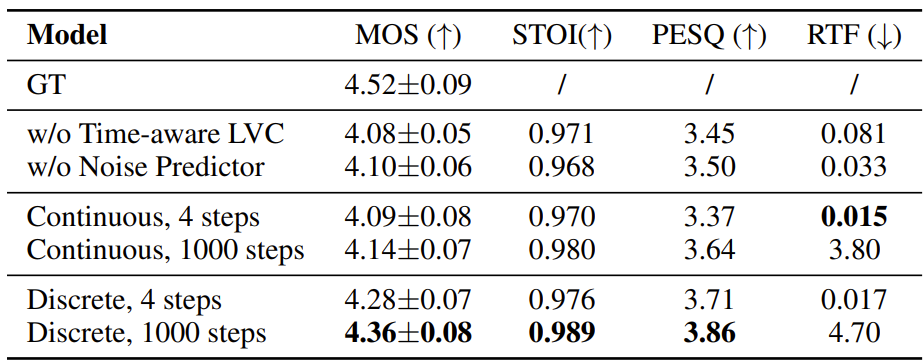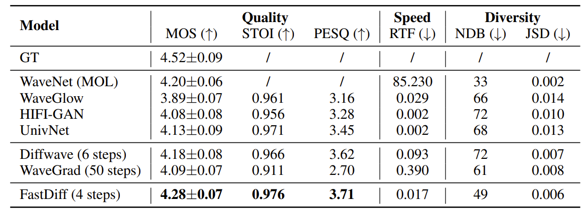 - MOS 측면에서 FastDiff는 ground-truth와 0.24의 차이만을 보이면서 가장 높은 품질을 달성했고 PESQ, STOI 측면에서도 상당한 개선을 보임