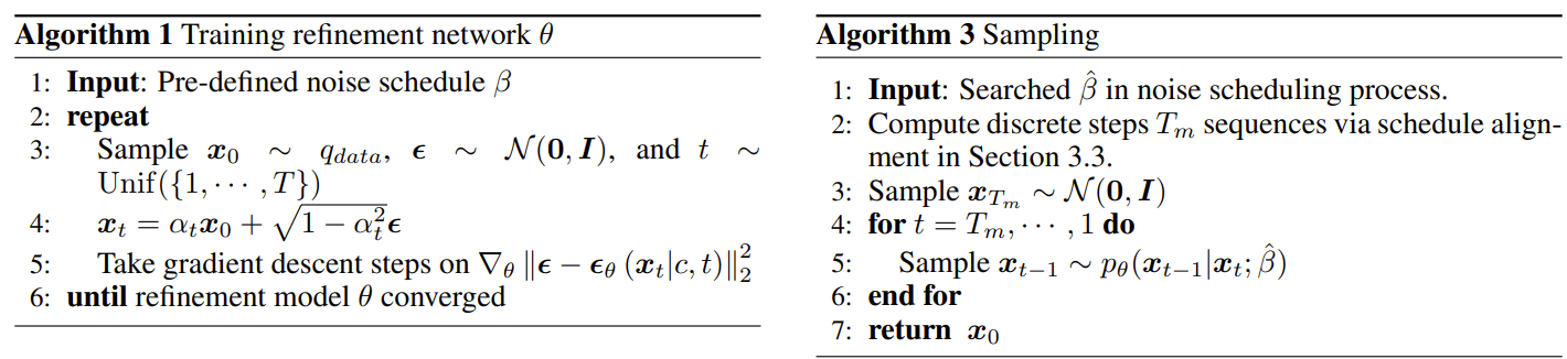 - Sampling 중에 $t$에 대한 condition이 필요한 경우, $N\ll T$를 사용하여 $T_{m}$-step sampling noise schedule $\hat{\beta}$를 $T$-step training noise schedule $\beta$에 aligning하여 $T_{m}$ discrete time index를 근사함