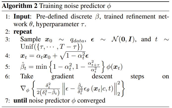 - 해당 scheduling method는 WaveGrad의 grid search나 DiffWave의 fast sampling보다 우수한 성능을 보임 - 여기서 noise predictor는 continuous noise schedule $\hat{\beta}\in \mathbb{R}^{T_{m}}$을 iteratively derive 함