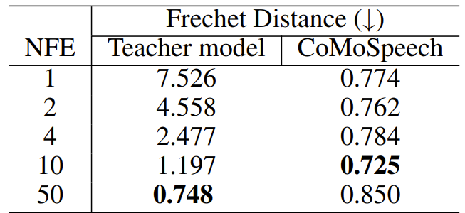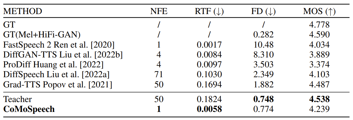 - 특히 추론 속도 측면에서 CoMoSpeech는 다른 diffusion-based 모델들보다 빠른 속도를 보임