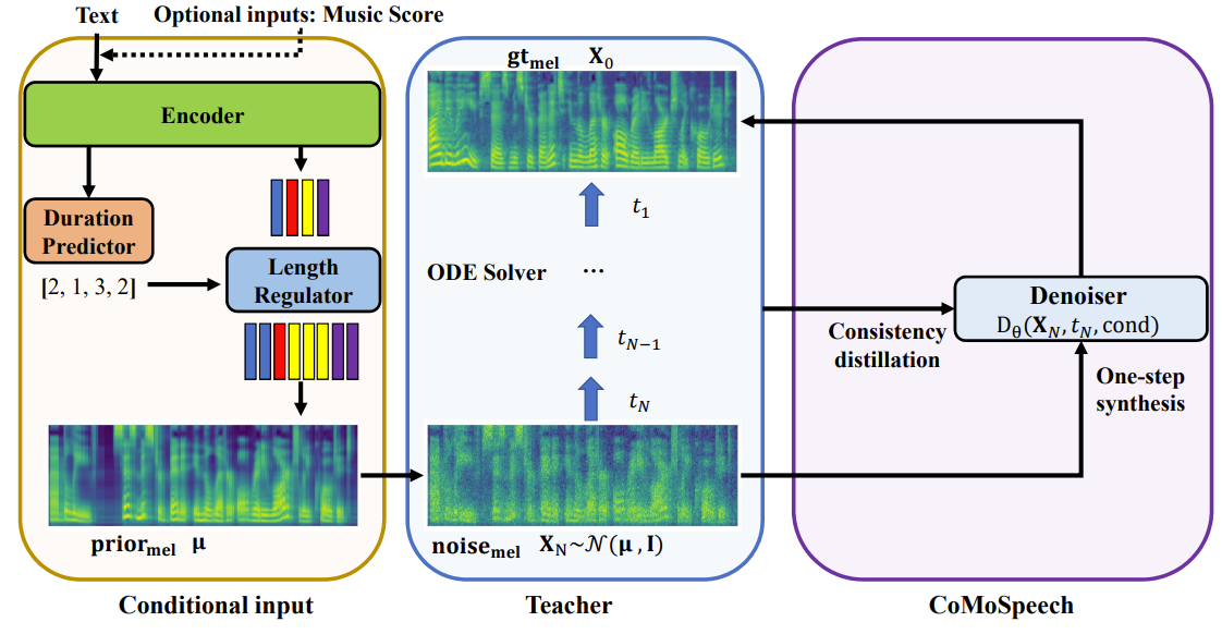 - CoMoSpeech는 TTS, SVS를 위한 one-step 음성 합성 모델로써, 아래 그림과 같이 구성됨