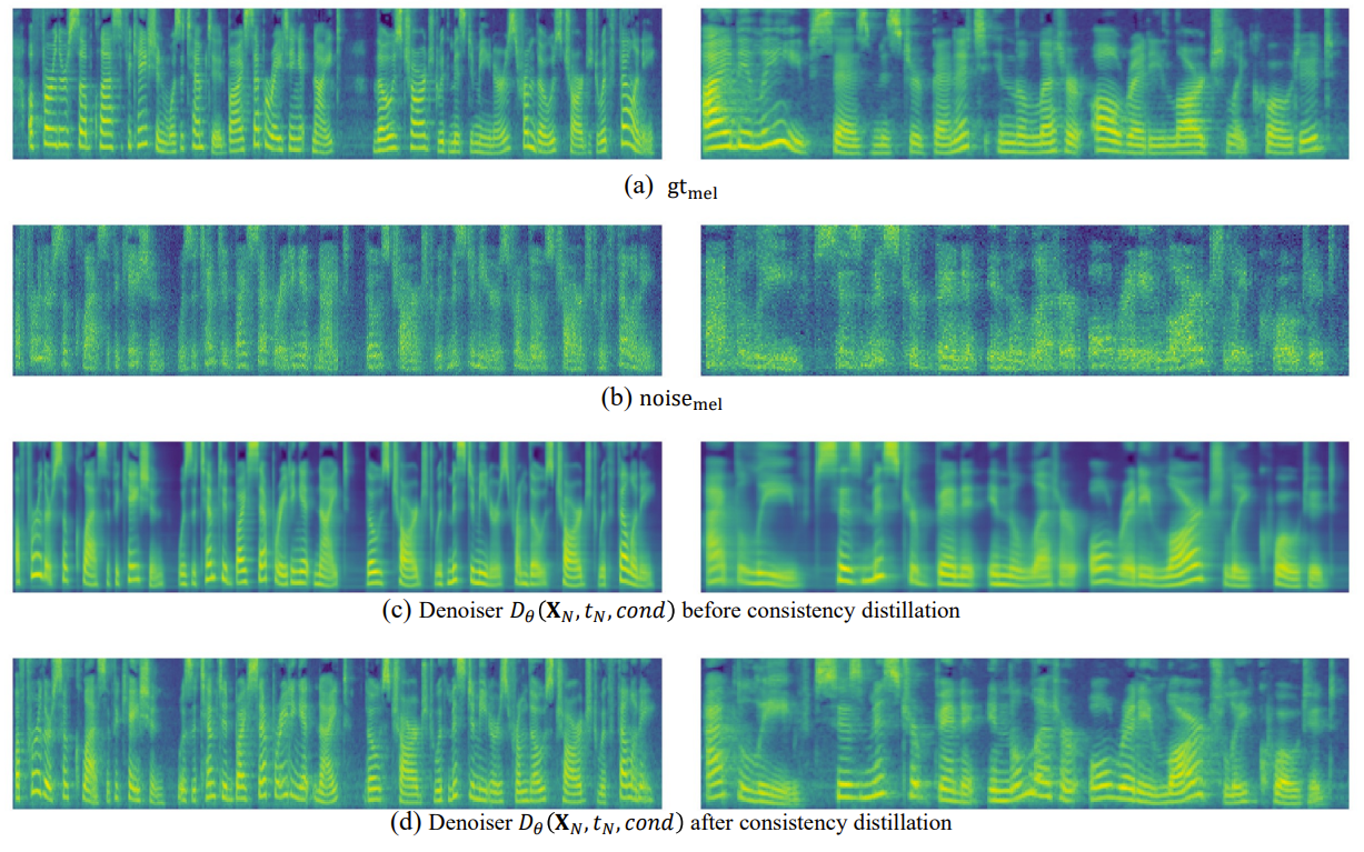 - Consistency distillation 전/후에 대한 mel-spectrogram을 비교해 보면,