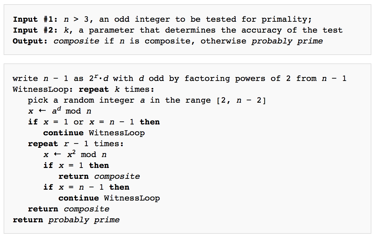- 1인 경우, (Eq. 3)이 성립하지 않으면 (Eq. 2)는 반드시 성립한다 - 결과적으로 밀러-라빈 판정법은 다음의 식이 모두 성립하지 않은 경우, $n$을 소수일 것 같다(probable prime)로 판별한다: