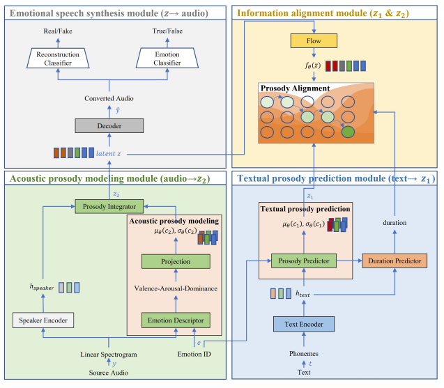 - 구조적으로 textual prosody prediction module, acoustic prosody modeling module, information alignment module, emotional speech synthesis module의 4가지 component로 구성됨