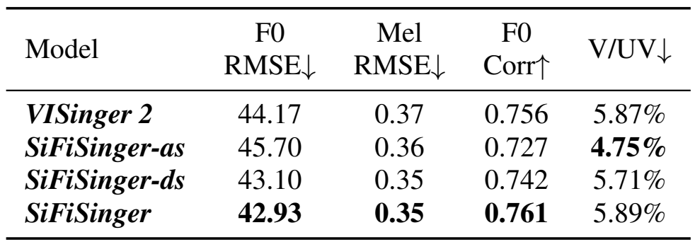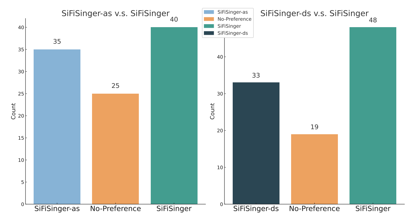- 정량적 지표 측면에서 SiFiSinger는 가장 우수한 성능을 달성함