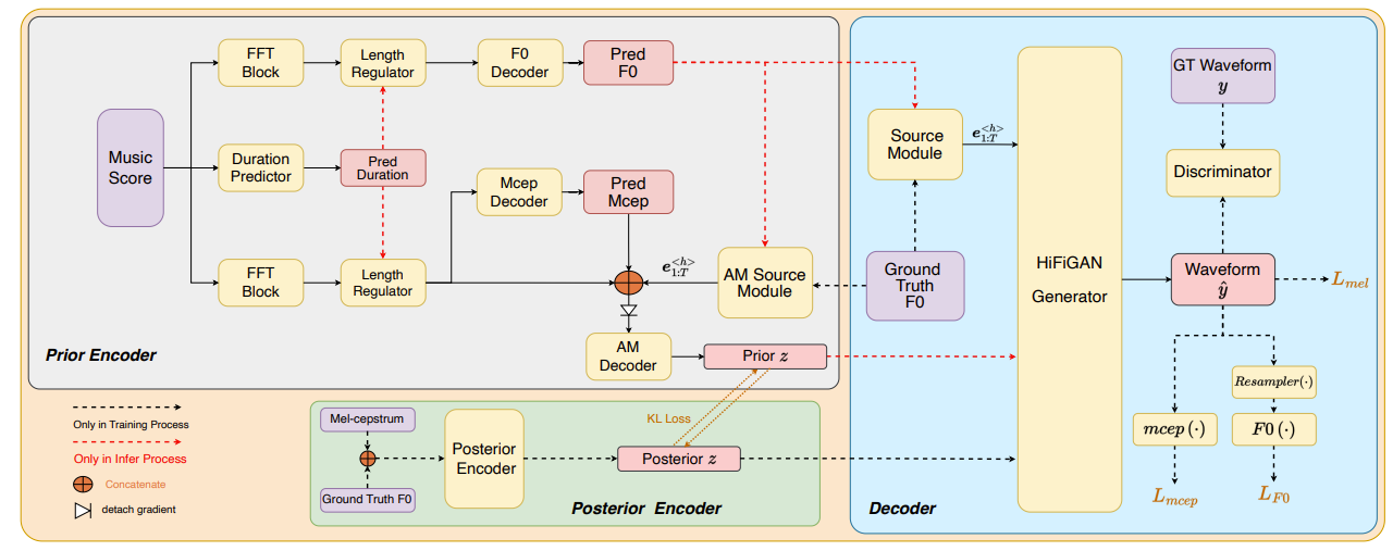 - 추론 시에 length regulator는 해당 duration predictor의 output을 length reference로 사용 - 결과적으로 music score encoder의 output인 $\text{mcep}$ feature와 acoustic model (AM) source module의 excitation signal을 기반으로, AM decoder는 frame-level prior distribution의 평균, 분산을 예측함