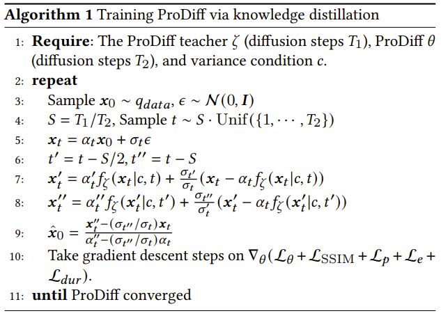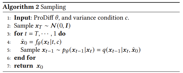 - ProDiff의 training과 sampling은 각각 [Algorithm 1], [Algorithm 2]와 같음