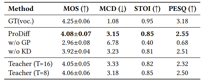 - 특히 ProDiff는 knowledge distillation을 통해 더 나은 성능을 달성할 수 있음