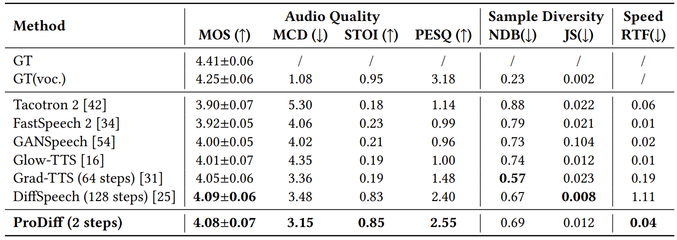 - ProDiff는 audio quality, sampling speed, diversity 측면에서 모두 우수한 성능을 보임