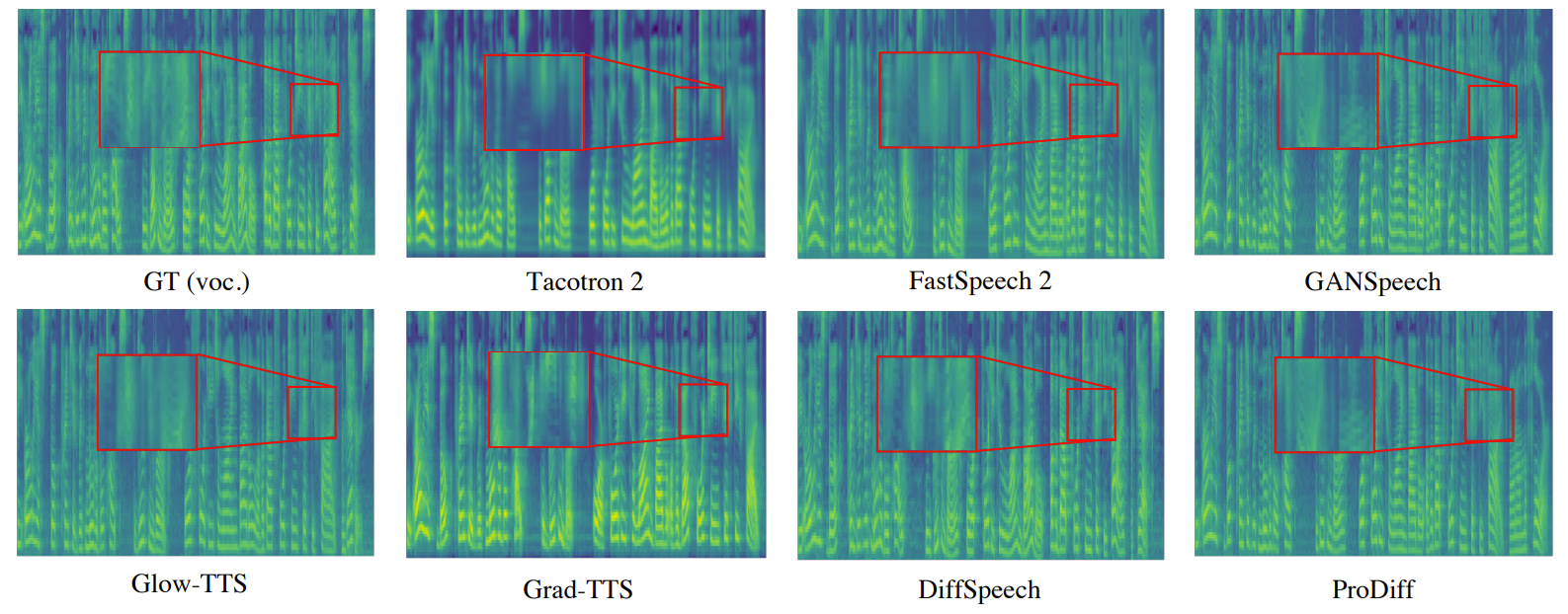 - Comparisons : Tacotron2, FastSpeech2, GANSpeech, Glow-TTS, Grad-TTS, DiffSinger