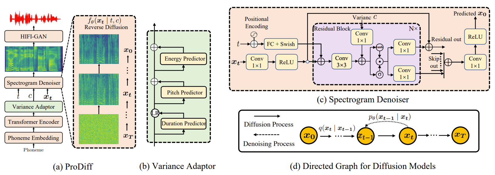 - 아래 그림과 같이 ProDiff는 phoneme encoder, variance adaptor, spectrogram denoiser로 구성됨