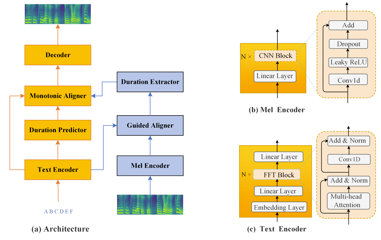 - TTS 합성 속도를 높이기 위해서는 non-autoregressive 모델과 같은 parallel architecture를 활용할 수 있고, 이때 모델은 input text와 output speech의 alignment를 학습할 수 있어야 함