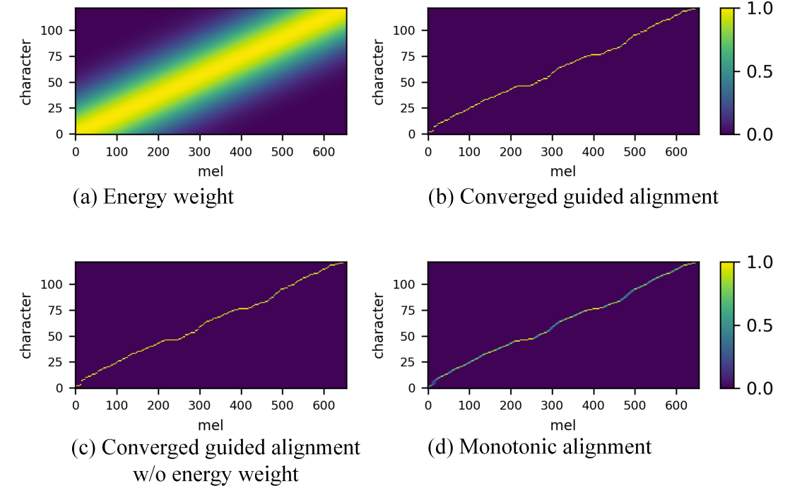 - 이는 guided aligner가 monotonic alignment를 생성하는 방법을 학습한다는 것을 의미 - 결과적으로 guided alignment를 기반으로 Eden-TTS는 (d)의 monotonic alignment를 얻을 수 있음