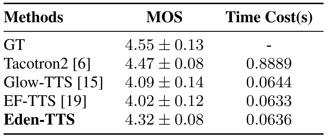 - Eden-TTS는 MOS와 time cost 측면에서 가장 합리적인 성능을 보임
