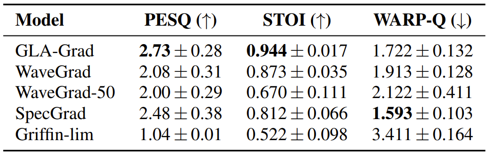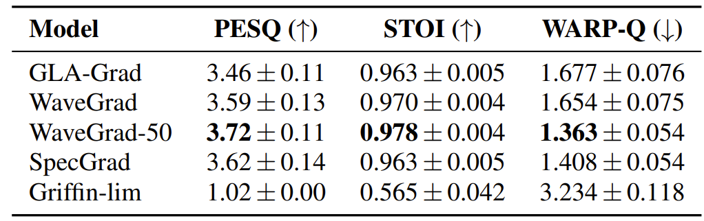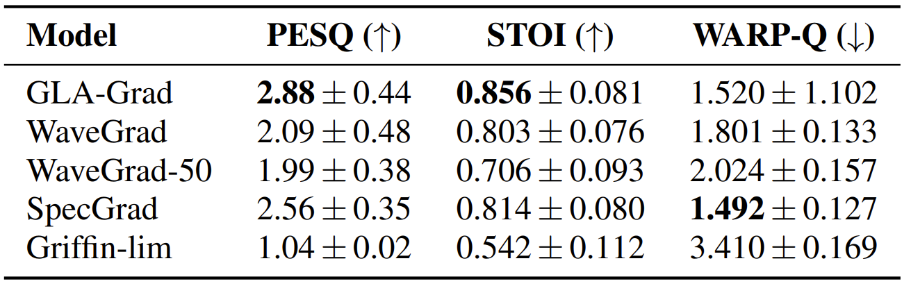 - LJSpeech에서는 WaveGrad의 성능이 좀 더 높았지만, GLA-Grad는 PESQ 측면에서 낮은 표준편차를 보이므로 보다 안정적인 output quality를 가짐