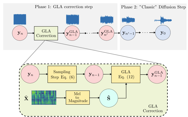 - 즉, (Eq. 6)의 WaveGrad update를 사용하여 $\mathbf{y}_{n-1}$을 얻은 다음, (Eq. 12)의 GLA correction을 통해 $\mathbf{y}_{n-1}^{GLA}$를 얻는 과정