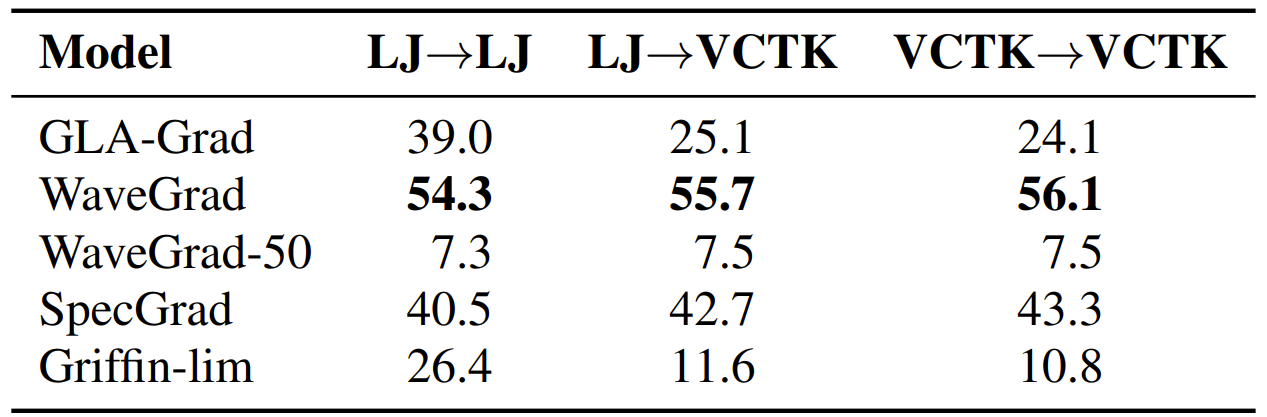 - 한편으로 LJSpeech에서 VCTK로의 generalization 측면에서는 GLA-Grad가 가장 우수한 성능을 보임