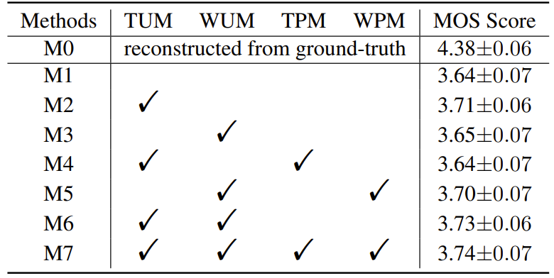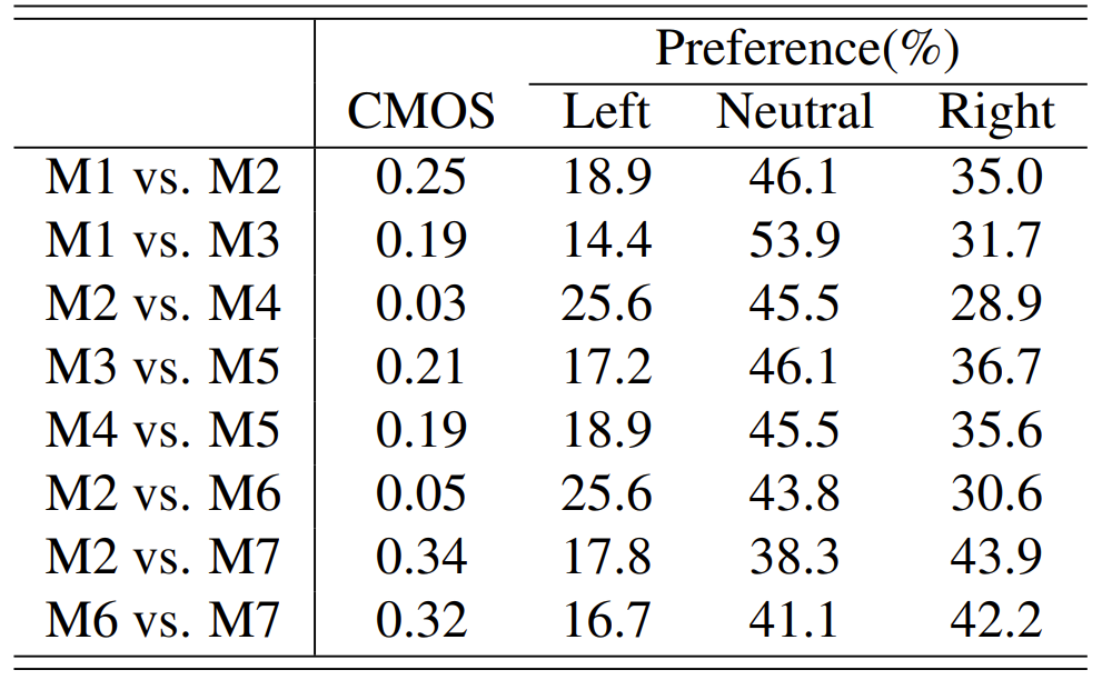 - MOS 측면에서 모든 component를 적용한 M7 (M2-CTTS)가 가장 높은 품질을 보임