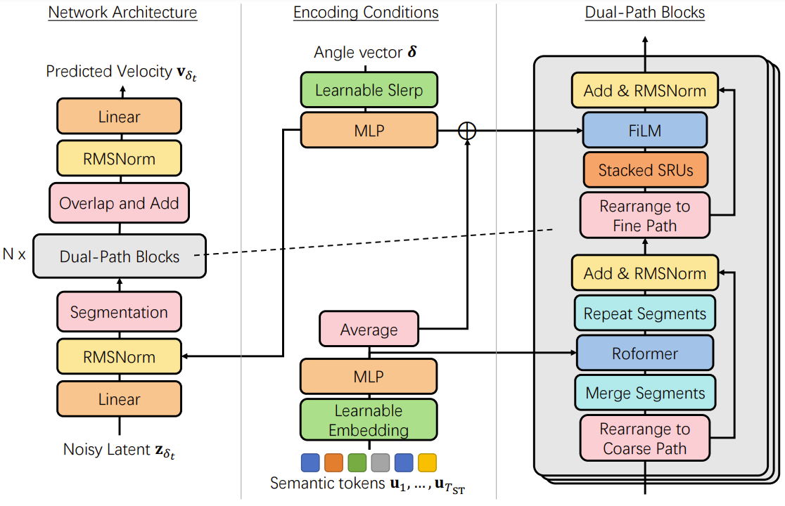 - Semantic conditioning strategy와 함께 coarse-/fine-acoustic information을 효율적으로 모델링하는 Dual-Path Diffusion model을 도입
