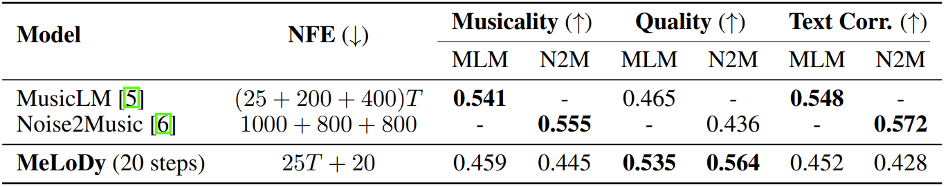 - Audio quality 측면에서 MeLoDy는 가장 뛰어난 성능을 보이고, musicality와 text correlation 측면에서도 comparable 한 성능을 보임