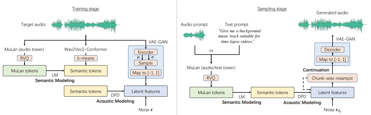 - Semantic modeling을 위해 MusicLM을 inherit 하고 dual-path diffusion과 audio VAE-GAN을 사용하여 conditioning semantic token을 waveform으로 decoding