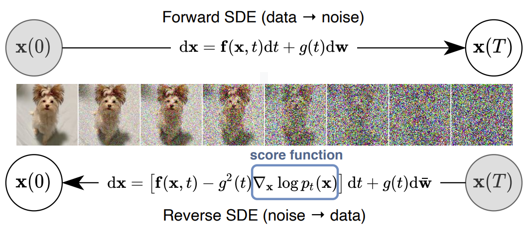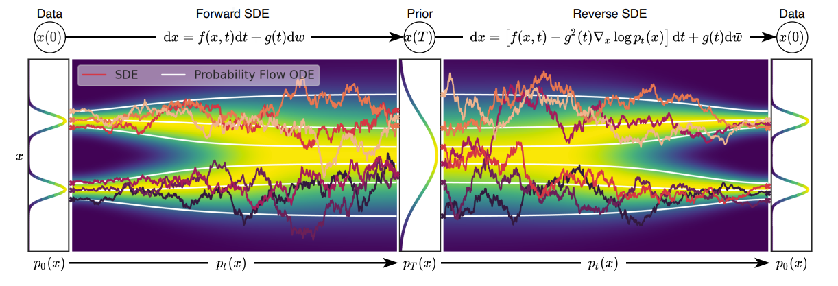 - Noise를 inject 하여 complex data distribution을 known prior distribution으로 변환하는 Stochastic Differential Equation (SDE)와 denoising을 통해 prior를 data distribution으로 변환하는 reverse-time SDE를 활용
