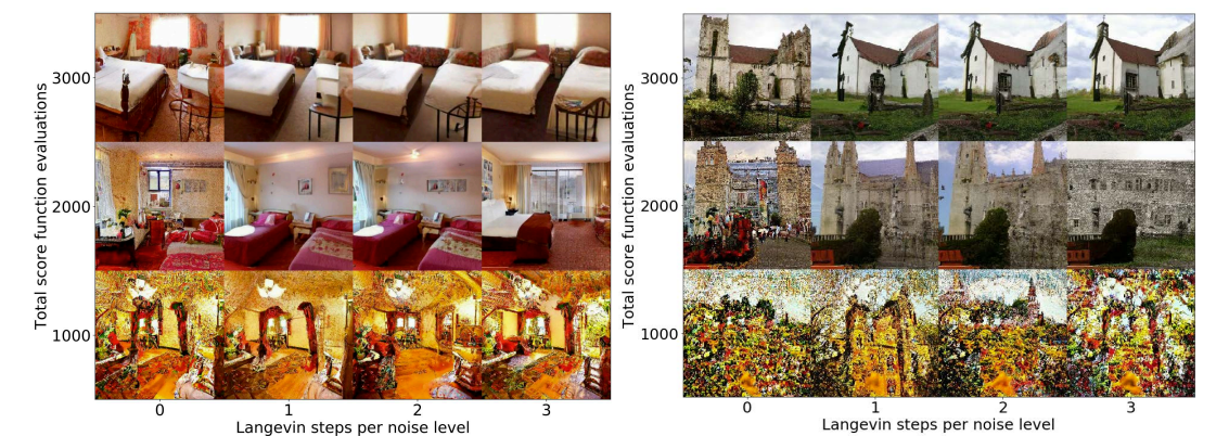 - 아래 그림과 같이 LSUN image에 대해 (Eq. 7)의 VE SDE로 training 된 모델의 합성 결과를 확인해 보면 PC sampler를 사용하는 것이 predictor-only sampler를 사용하는 것보다 우수한 결과를 보임