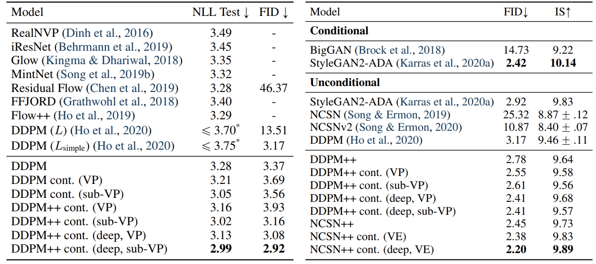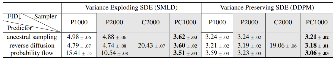 - VE SDE에 대한 optimal architecture인 NCSN++는 PC sampler를 사용하여 CIFAR-10에서 2.45 FID를 달성함