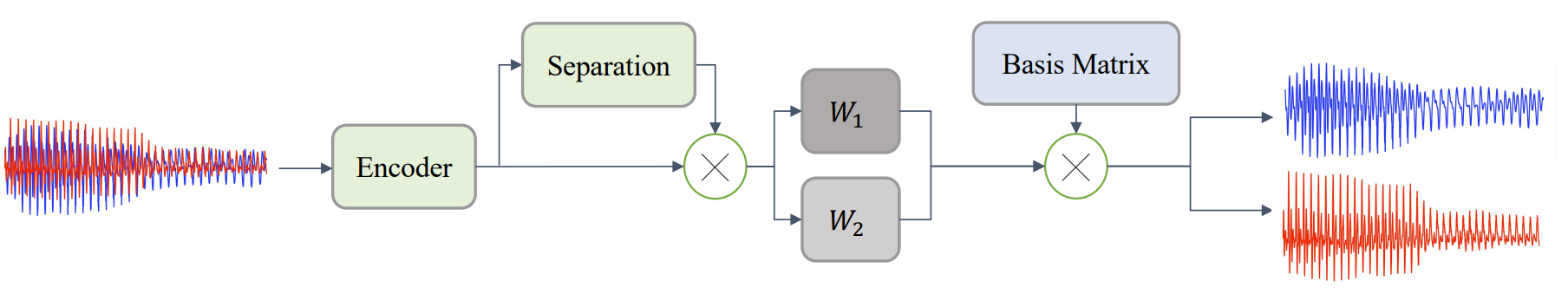- 구조적으로 TasNet은 아래 그림과 같이 encoder network, separation network, 다른 network와 jointly learn 되는 basis matrix를 활용
