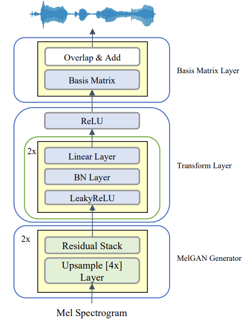 - Basis-MelGAN은 MelGAN generator, Transform layer, TasNet에서 학습된 Basis Matrix Layer로 구성되어, 아래 그림과 같이 mel-spectrogram을 input으로 하여 audio waveform을 output 함