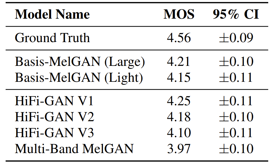 - MOS 측면에서 Basis-MelGAN은 우수한 합성 성능을 달성함
