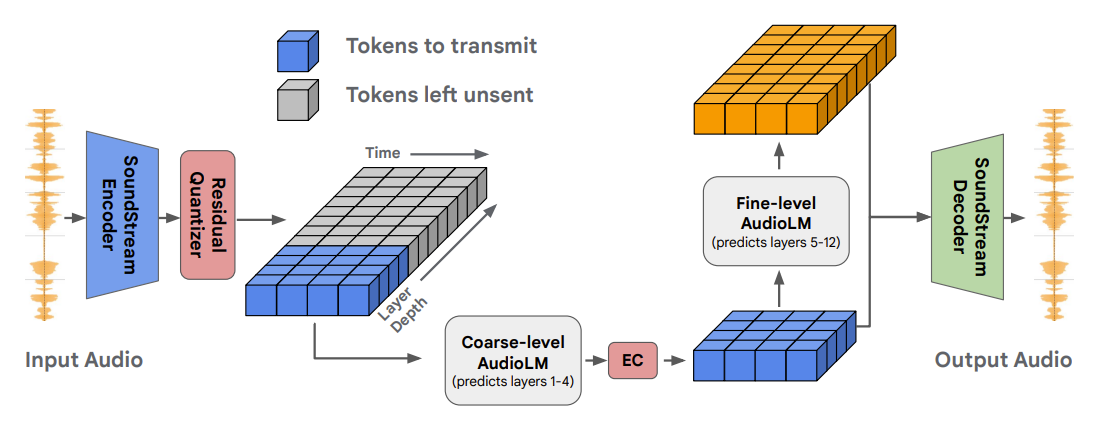 - 결과적으로 transmitted coarse-level token에서 fine-level AudioLM을 사용하여 fine-level token을 합성하고 SoundStream decoder를 사용하여 fine-level, coarse-level token 모두에서 audio를 생성함