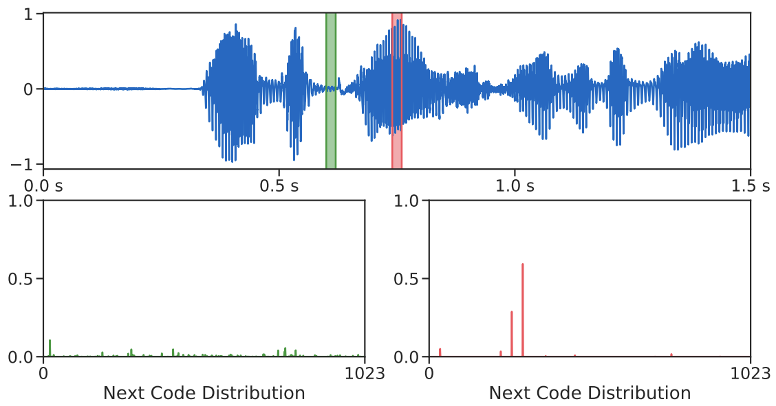 - 한편으로 AudioLM의 code prediction distribution을 시각화해 보면, audio input이 phoneme의 중간인 경우 confident 한 예측이 가능함
