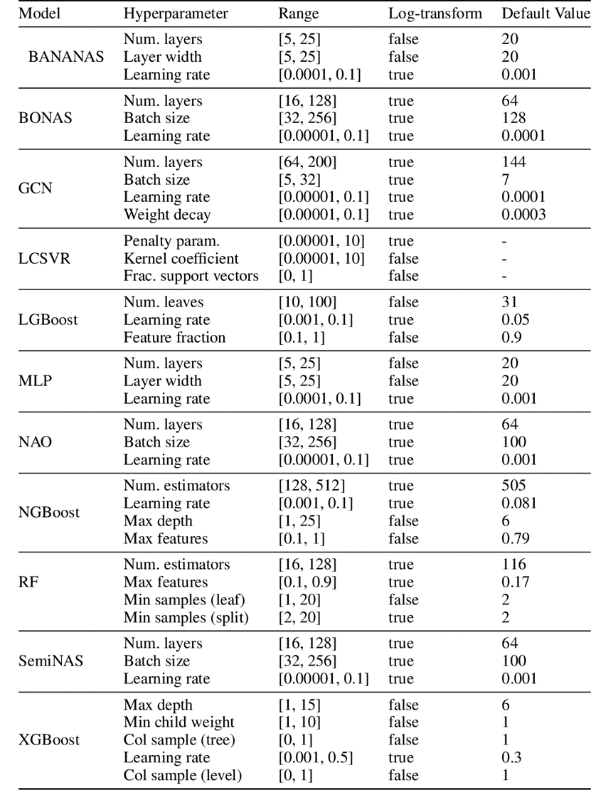 - datasets : NAS-Bench-101, Nas-Bench-201, Nas-Bench-301, Nas-Bench-NLP