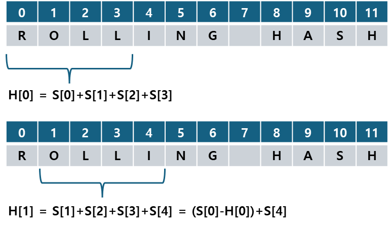 #다음 sub-string으로 slide하여 해시 값 계산 (rolling hash)