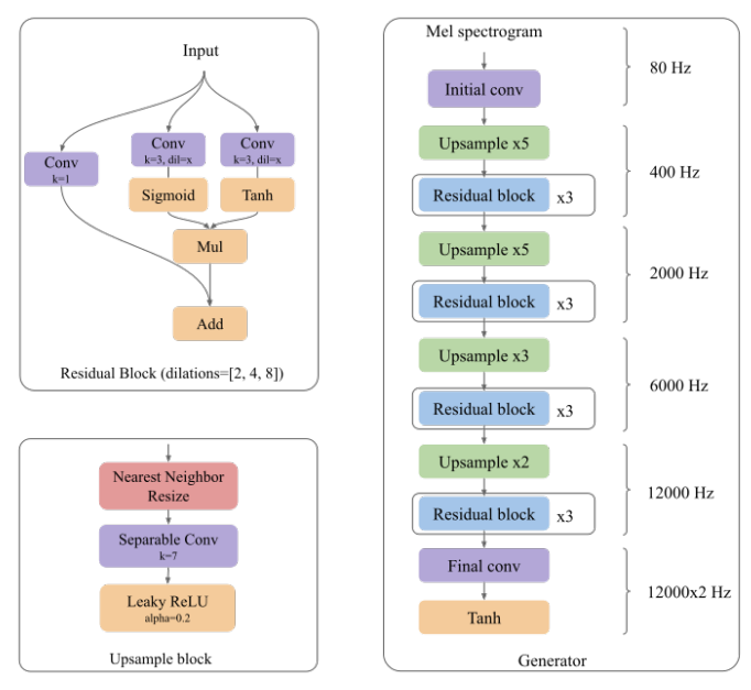 - Upsampling block의 추론 속도를 개선한 mobile device 용 neural vocoder