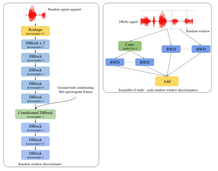 - 이후 해당하는 ground-truth mel-spectrogram conditioning과 함께 각 random window discriminator에 전달됨