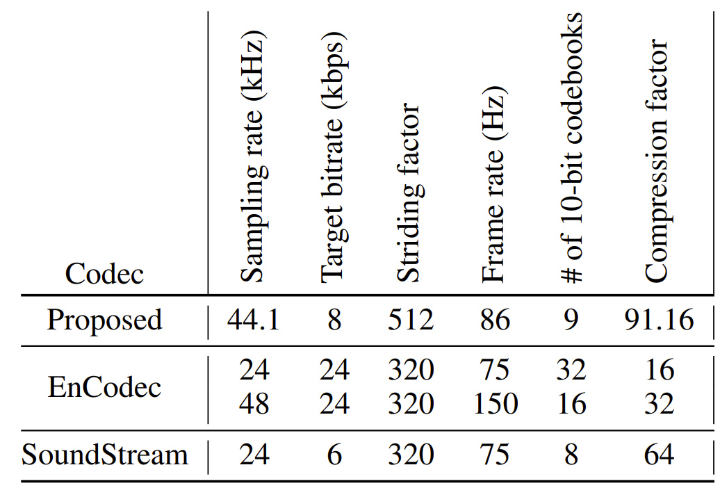 - 여기서 $S=f_{s}/M$으로 정의된 frame rate - 요약적으로 아래 표와 같이 기존 codec들의 compression factor와 latent code의 frame rate를 비교했을 때, 제안하는 Improved RVQGAN은 모든 기존 codec들에 비해 더 높은 compression factor를 달성할 수 있음
