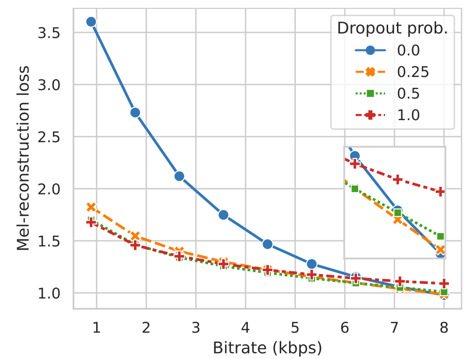 - 추가적으로 quantization dropout 역시 성능에 영향을 미치는데, dropout이 0인 경우 codebook 수가 적어 낮은 reconstruction 성능을 보임