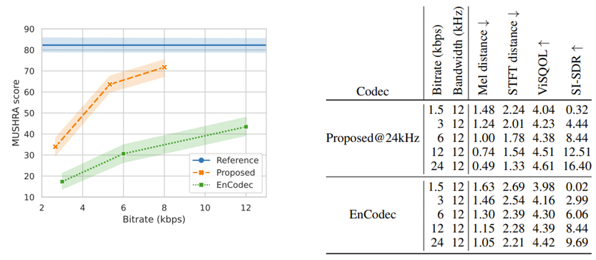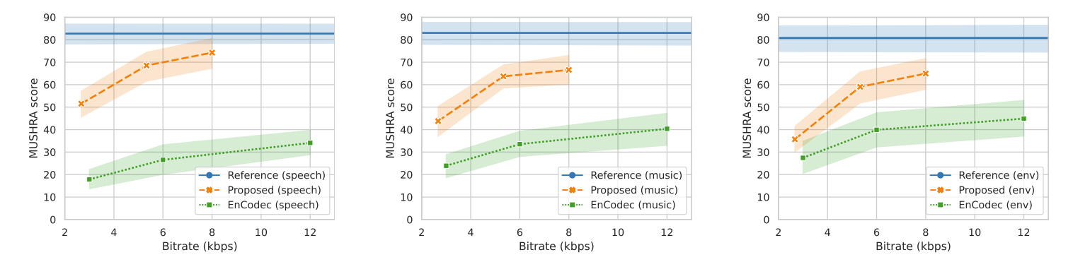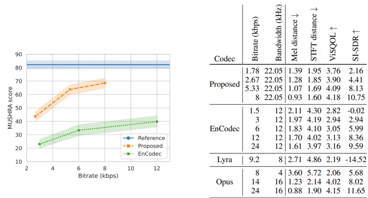 - 결과적으로 speech, music, environment 등의 다양한 sound에 대해서 high-fidelity의 품질과 효과적인 compression 성능을 달성