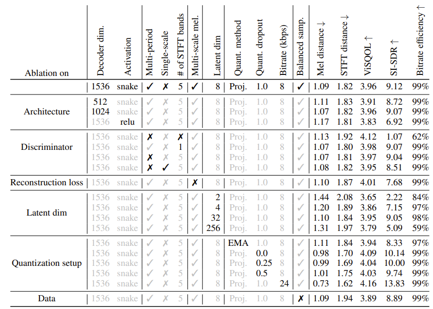 - 특히 24kHz sampling rate에서 EnCodec과의 비교해 보면, Improved RVQGAN은 지속적으로 우수한 성능을 달성함