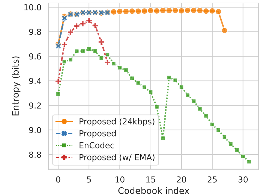 - 한편으로 exponential moving average로 codebook을 학습하면 SI-SDR에 대한 성능 저하가 발생하고, 아래 그림과 같이 모든 codebook에서 codebook utilization이 떨어짐