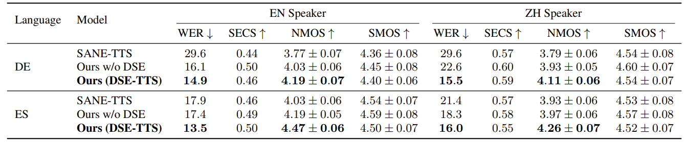 - 구체적으로 DSE-TTS는 각 language에 대해 4.3 이상의 NMOS를 달성함