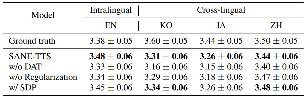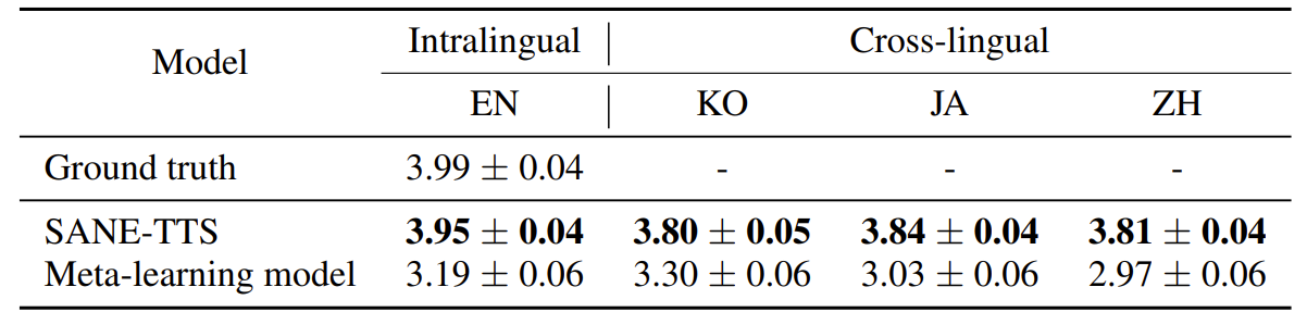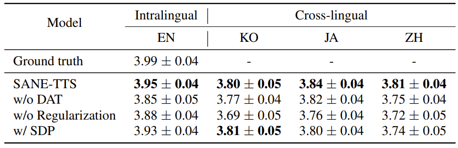 - 아래 표와 같이 MOS 측면에서 SANE-TTS는 naturalness와 speaker similarity 모두 가장 뛰어남